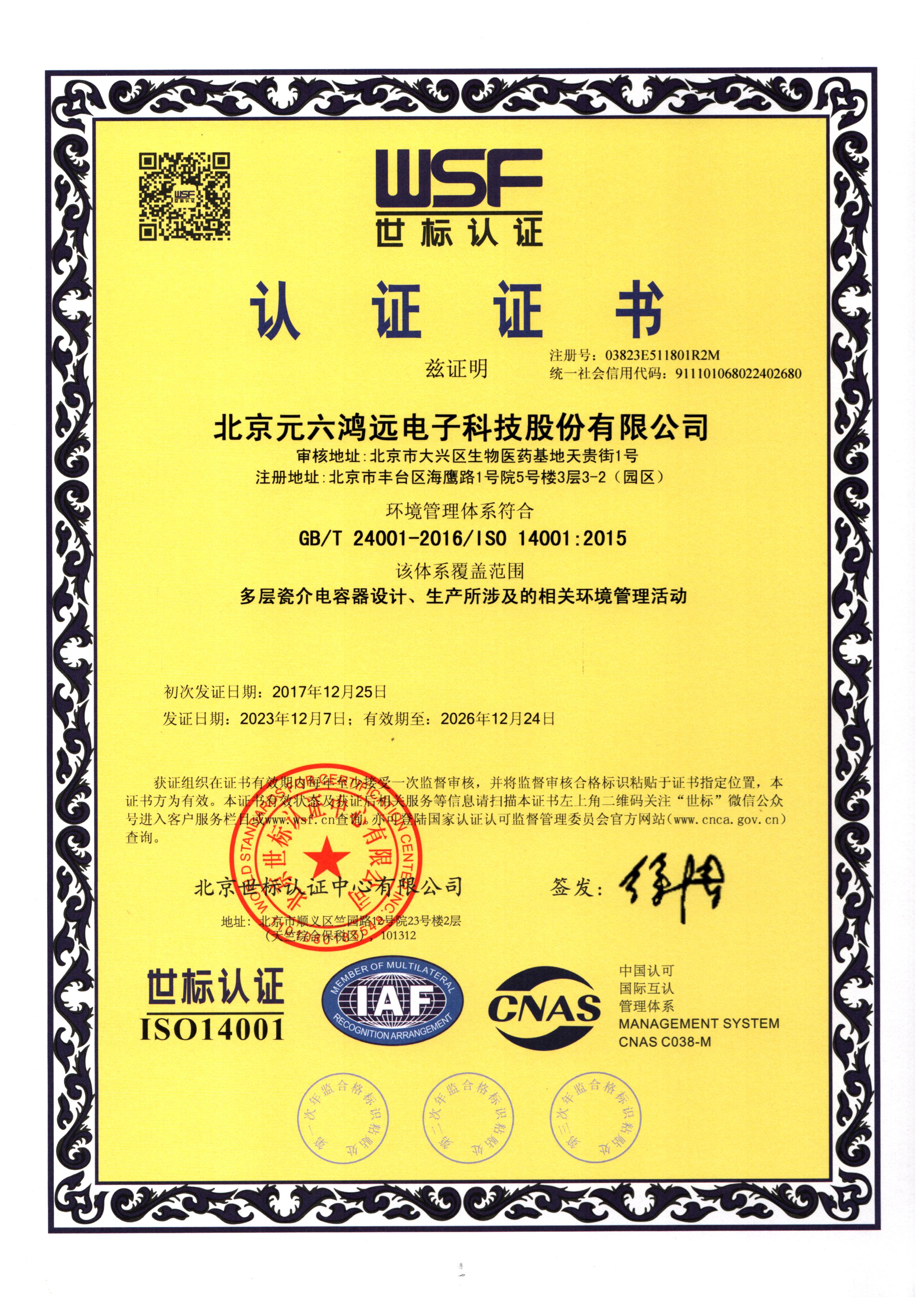ISO14001环境管理体系证书